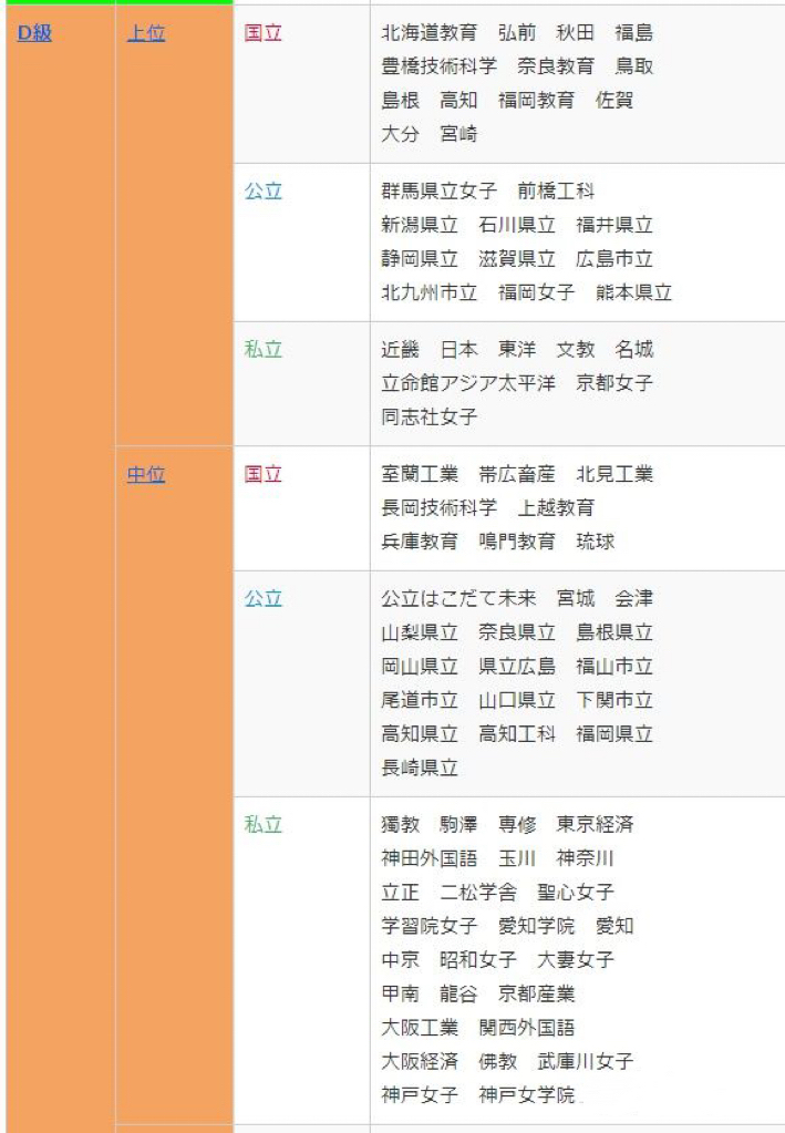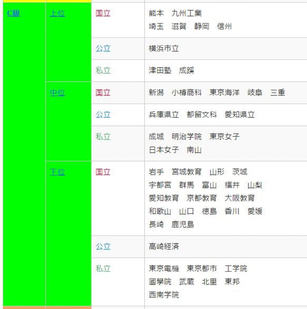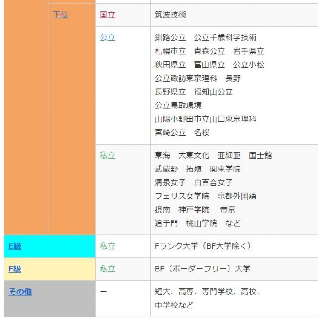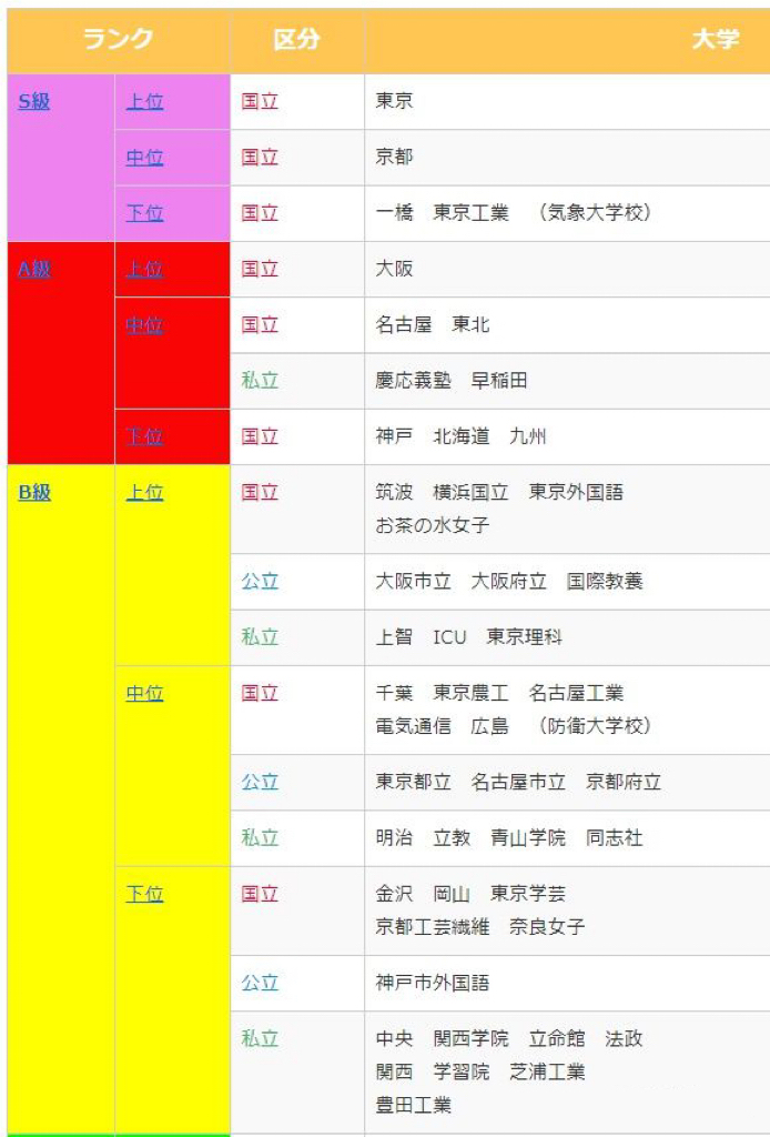 根據(jù)偏差值的綜合系數(shù),再加入就業(yè)率、名氣等,把大學(xué)分為:S、A、B、C、D、E、F等級(jí)來區(qū)分,日本的大學(xué)成績也是按這個(gè)字母的順序評(píng)價(jià)的。