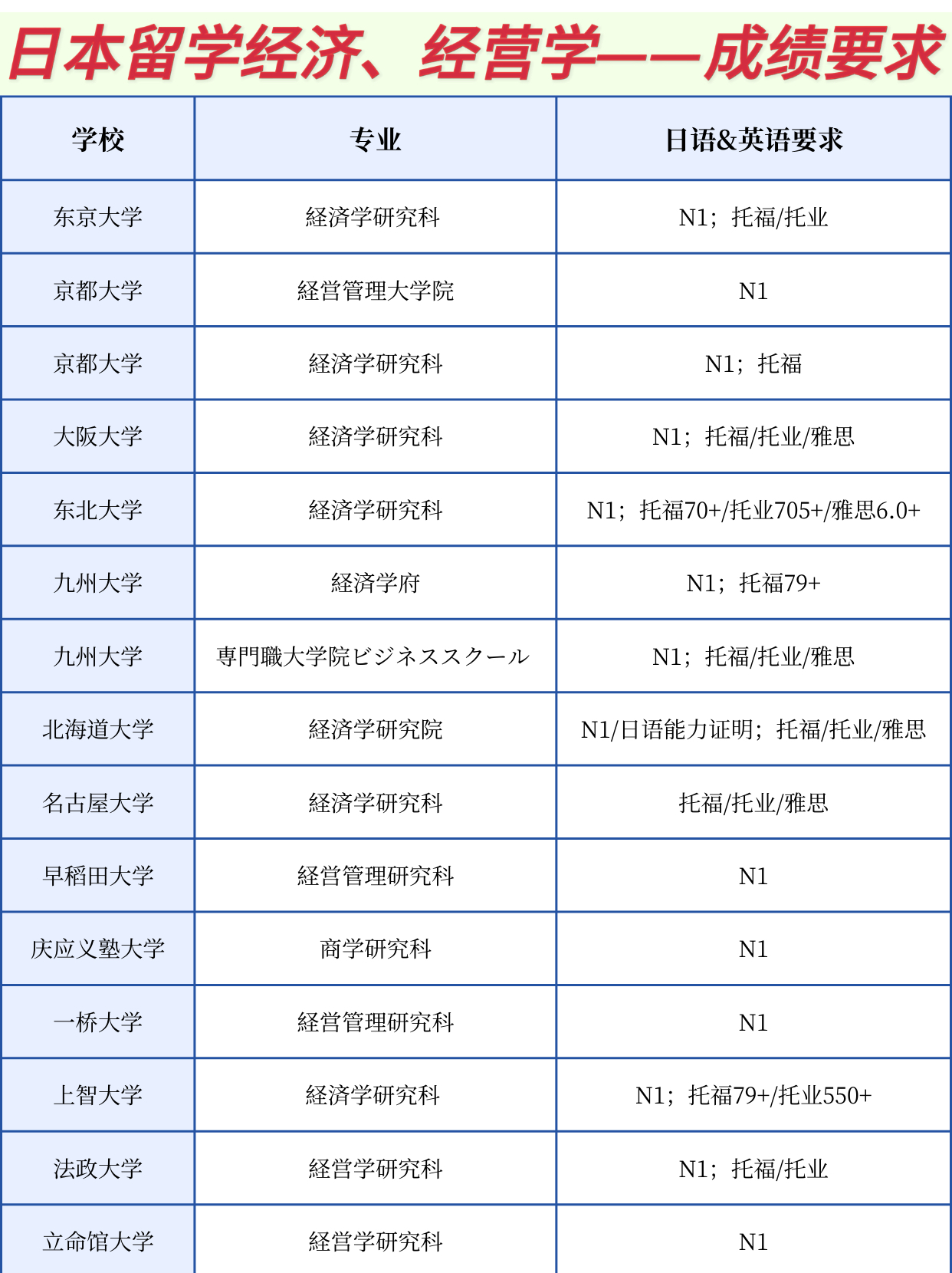 在查閱了部分日本大學(xué)的經(jīng)濟(jì)學(xué)及經(jīng)營(yíng)學(xué)研究科的募集要項(xiàng)之后,整理出該表格。日本每所大學(xué)的官網(wǎng)以及專業(yè)設(shè)置的分類都各有差別,比如在東京大學(xué)的經(jīng)濟(jì)學(xué)研究科中就既包含了經(jīng)濟(jì)學(xué)又包含了經(jīng)營(yíng)學(xué),但在京都大學(xué)又將這兩門學(xué)科各自分開在不同的研究科。