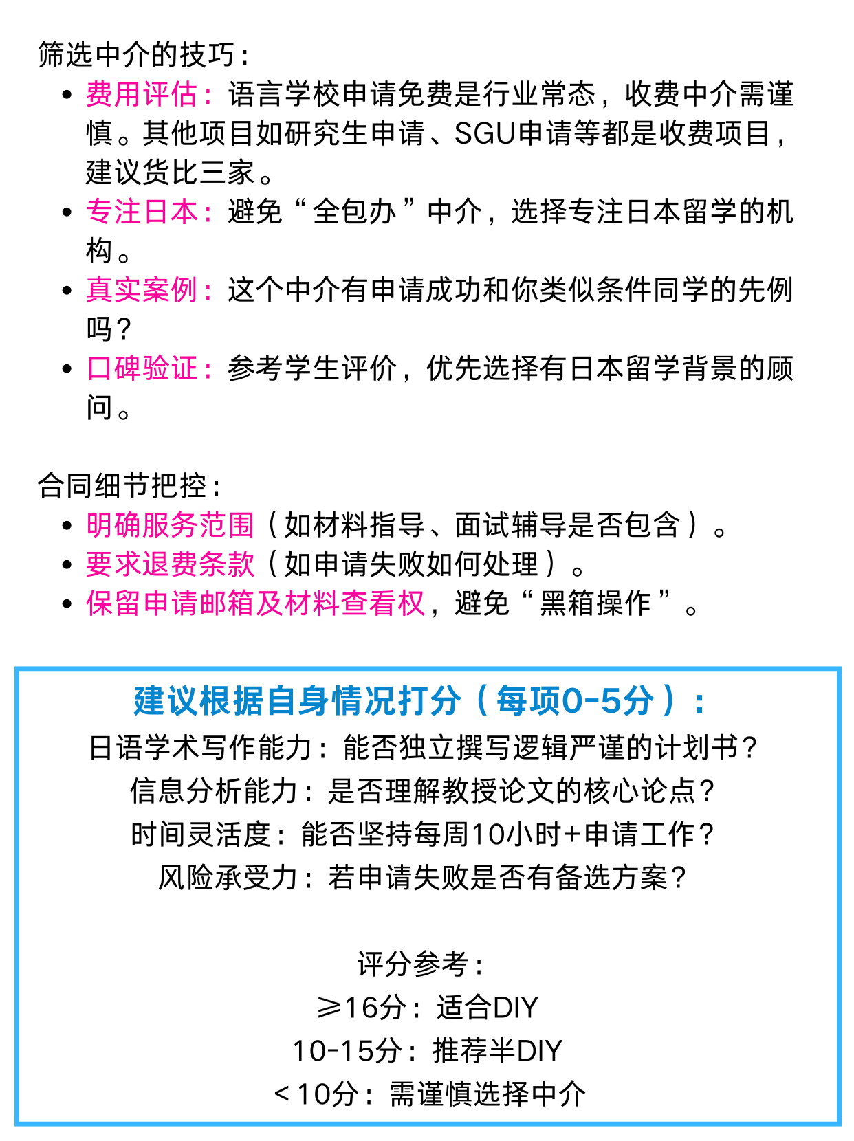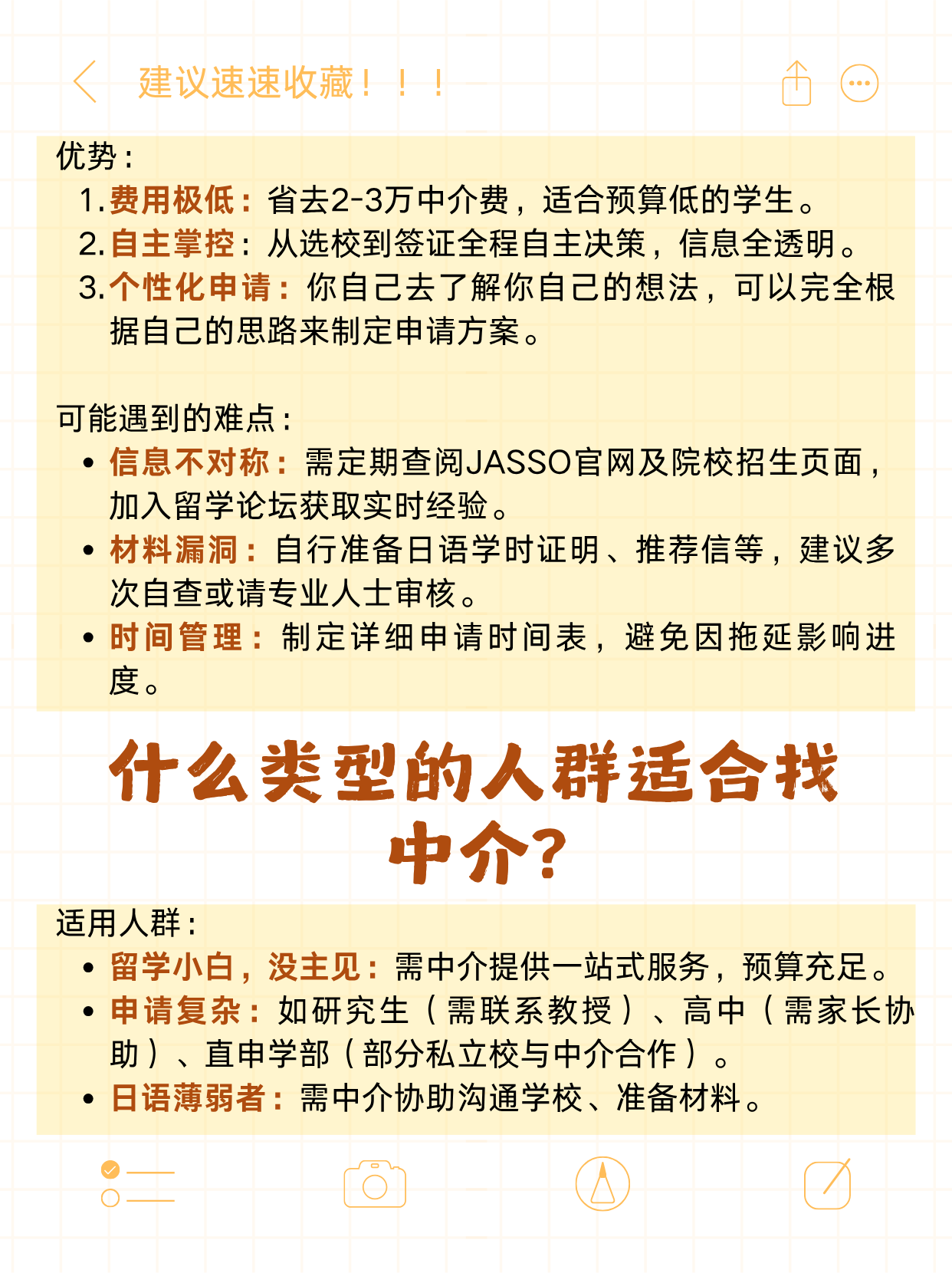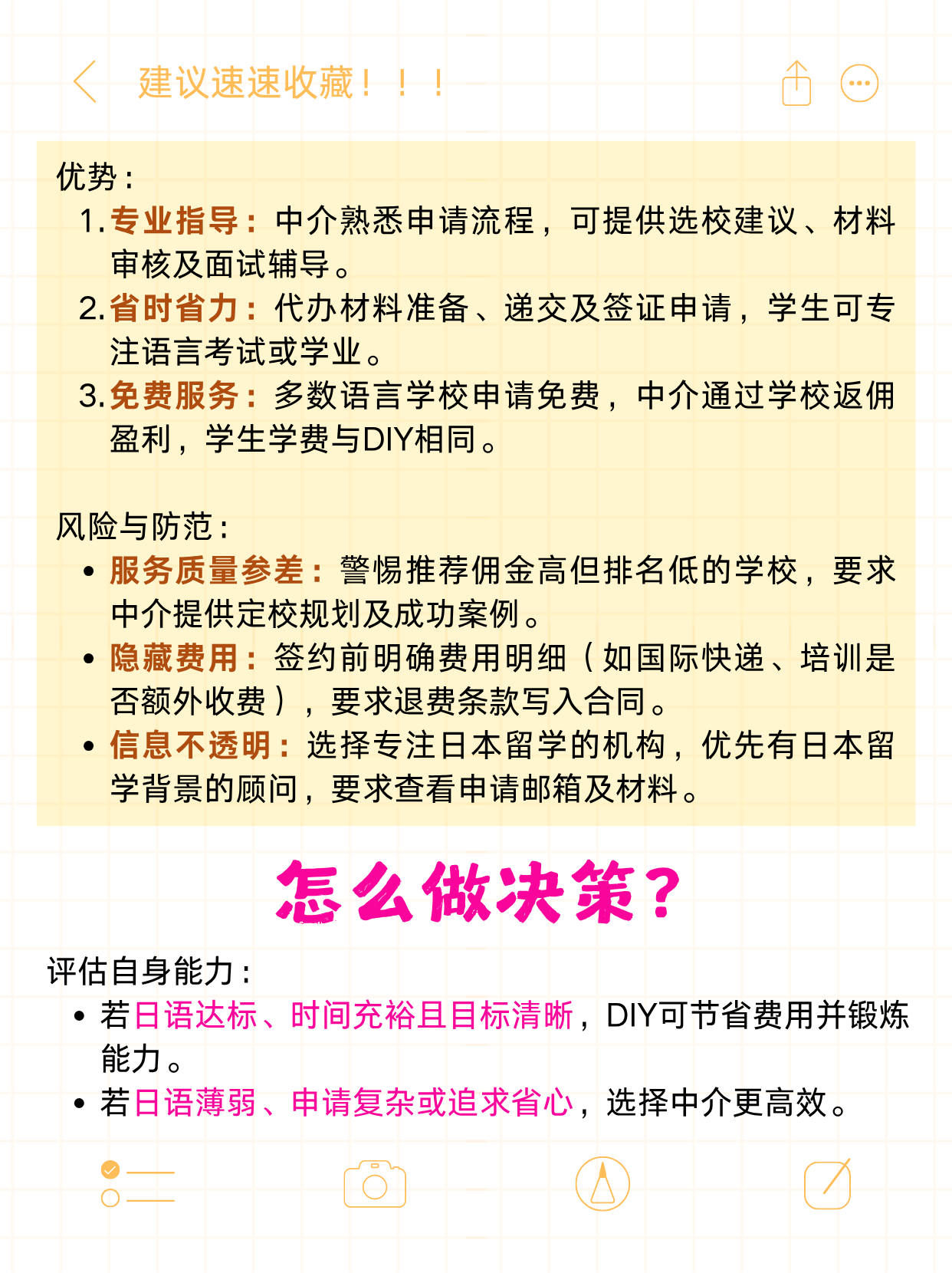 沒有絕對,只有適合。DIY適合能力強、時間充裕的學(xué)生,而中介對復(fù)雜申請或日語薄弱者更具價值。關(guān)鍵在于根據(jù)自身條件選擇,并做好充分調(diào)研以規(guī)避風(fēng)險。無論選擇哪種方式,留學(xué)申請的核心都是提前規(guī)劃、充分準(zhǔn)備。