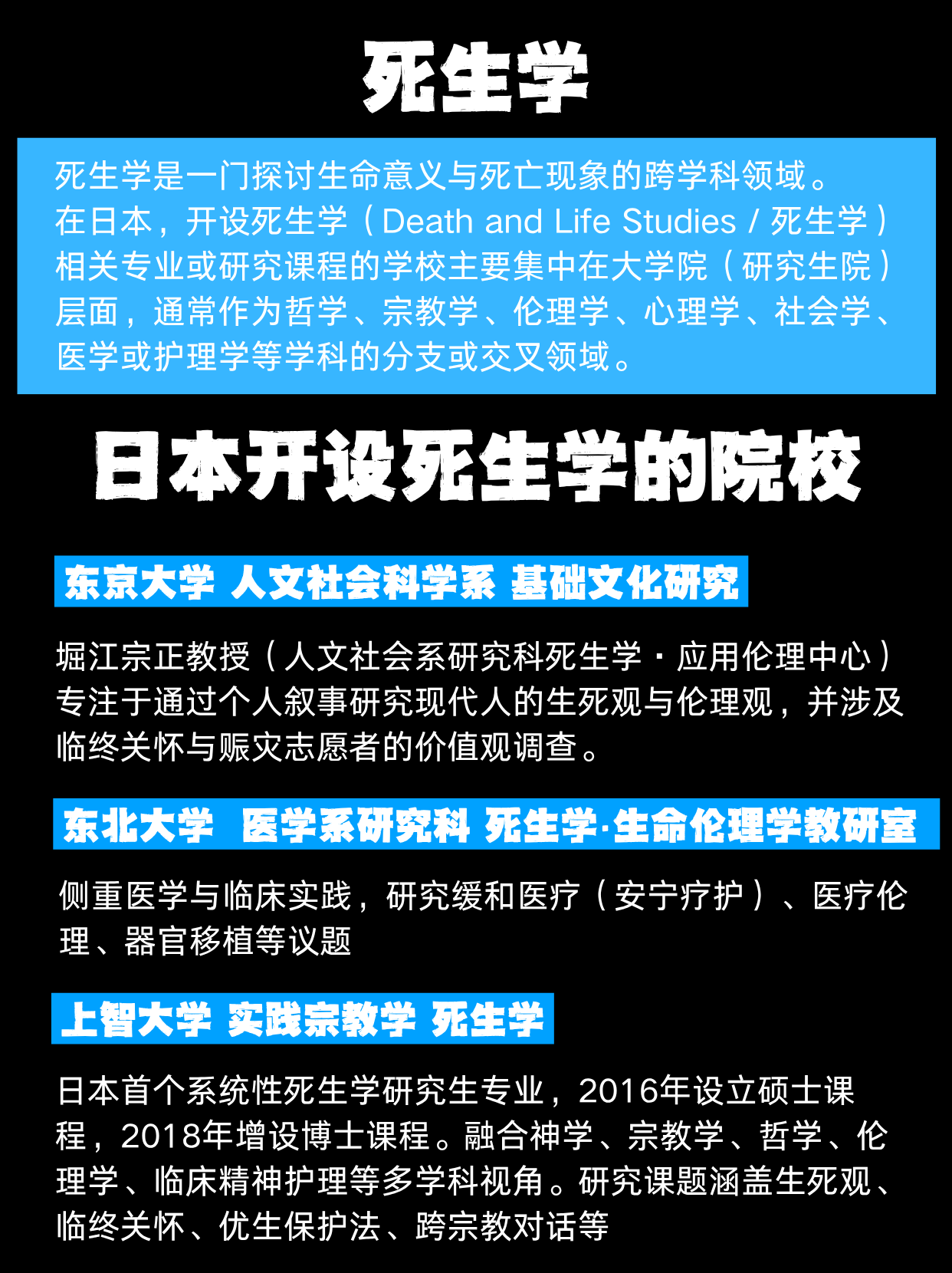 在這種生死觀下,日本開設(shè)了相當(dāng)具有本國特色的專業(yè)——死生學(xué)。