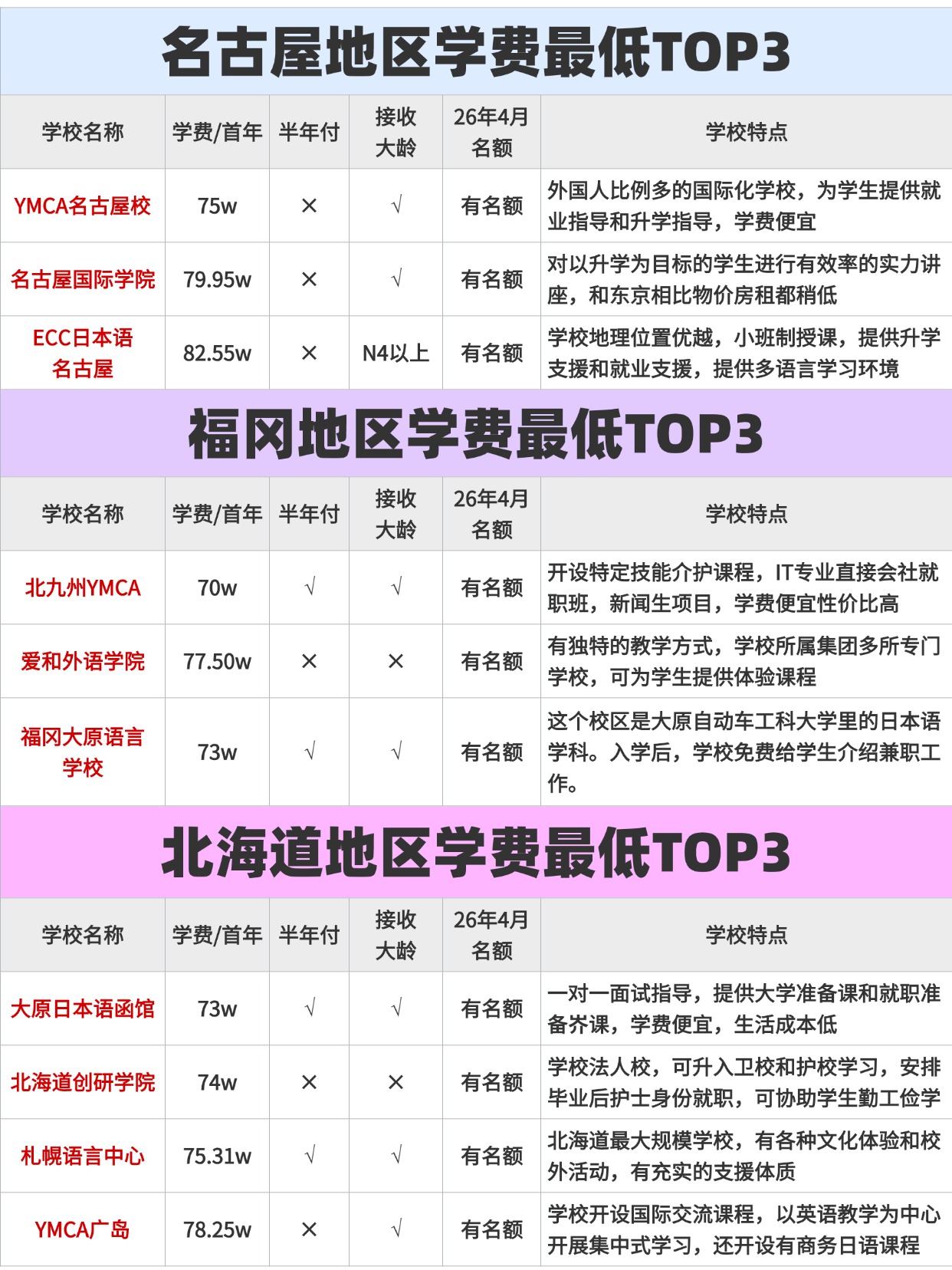 其他城市:(如福岡、札幌、名古屋等)生活成本低,安靜適合學習,中國人相對較少,利于日語提升。