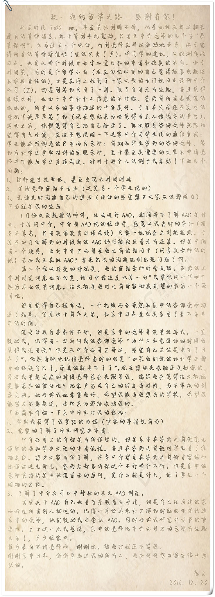 我是之前在某中介申請不順利,退辦后。在樂申日本進(jìn)行申請。申請過程中經(jīng)歷了很多坎坷比如教授的拒信等等,拒信對我來說等于最大的坎坷。但是最終如愿去了京都大學(xué)。下面講述的是一件發(fā)生在我身上的留學(xué)申請故事。