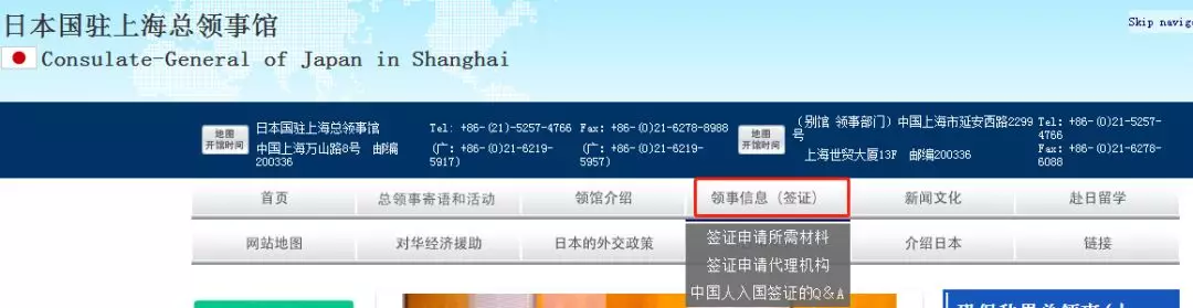 明確總領(lǐng)事館或常駐領(lǐng)事辦事處之后,點(diǎn)擊進(jìn)入領(lǐng)事館首頁(yè)(以下以日本駐上??傤I(lǐng)事館為例)