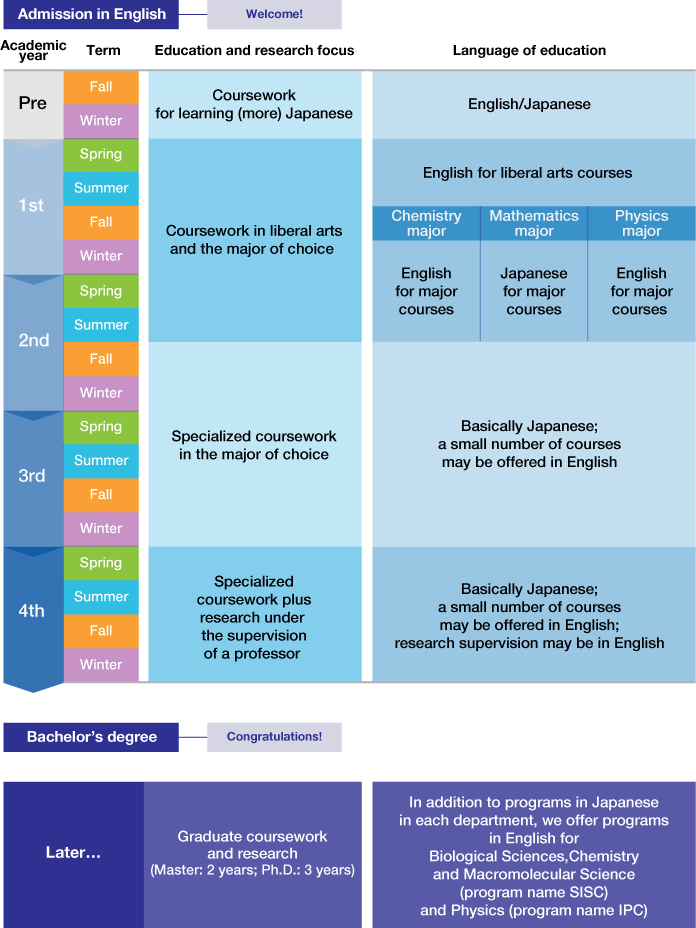 學(xué)生將總共學(xué)習(xí)4.5年(研究生(非正式生)半年,本科生四年),并最終獲得學(xué)士學(xué)位。該項目由大阪大學(xué)國際學(xué)部和理學(xué)部負責。