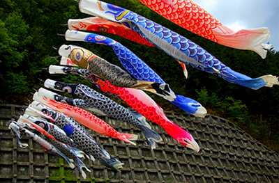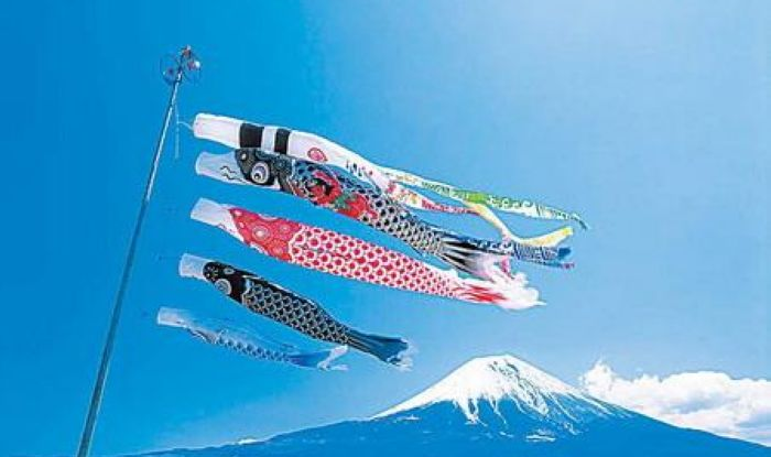 為了祝福家中的男孩健康、快樂,這一天日本家家戶戶都會(huì)用紙或布做成色彩鮮艷、形狀像鯉魚的彩帶,然后把這些彩帶串在竹竿上,并和金色的風(fēng)車綁在一起,掛在屋頂上。